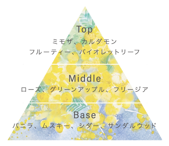 トップは、若々しいミモザの穂がふわっと揺れるような、ややグリーンを帯びた爽やかな調香。