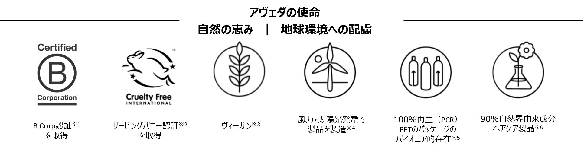 ※2 リーピングバニー認証とは、クルエルティフリー・インターナショナルによって、製品開発~製造工程で動物実験を行っていないブランドに付与される、国際的に認められている最高水準の認証です。 ※3 動物実験も行わず、動物由来成分も使いません。 ※4 製品の製造には、(米国の)再生可能エネルギークレジットやカーボンオフセットを通じてアヴェダの太陽電池や風力エネルギーによる電力が供給されています。更に、工場施設において、2023年末までに、ULスキームによるごみ廃棄場のシルバーゼロ ウェイスト認証を取得できるよう取り組んでいます。※5 85%以上のスキンケアおよびヘアスタイリングのPETパッケージとジャー容器は再生(PCR)PETを100%使用しています。 またアヴェダは美容業界において、100%再生(PCR)PETパッケージを採用した初めての化粧品会社です。