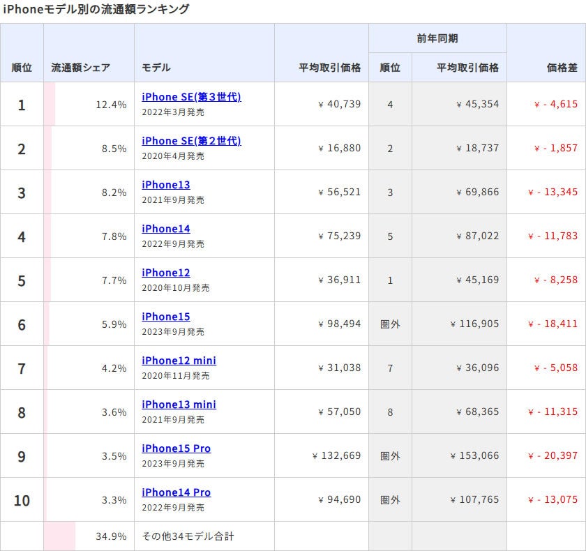 iPhoneモデル別の流通額ランキング