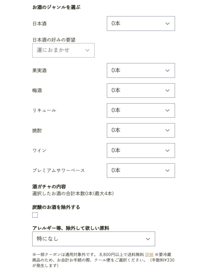 日本酒の甘口、辛口などの味わいの好みを指定できるほか、炭酸のお酒を除外することもできるなど、自分の好みに合わせて好きな組み合わせのお酒が届くように指定出来ます。