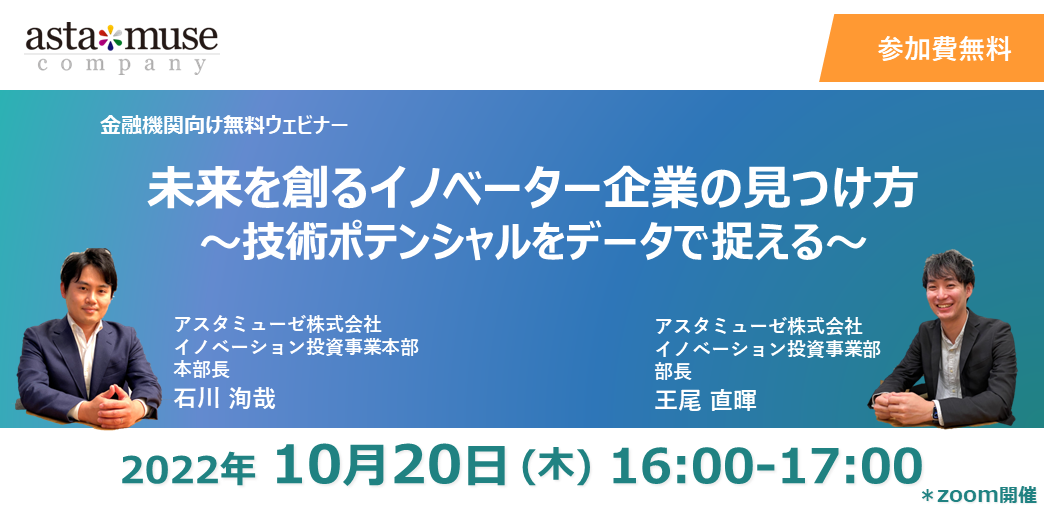 アスタミューゼ株式会社(本社:東京都千代田区、代表取締役社長 永井歩)は、2022年10月20日(木)16時より「未来を創るイノベーター企業の見つけ方~技術ポテンシャルをデータで捉える~」と題し、無料ウェビナーを開催いたします。