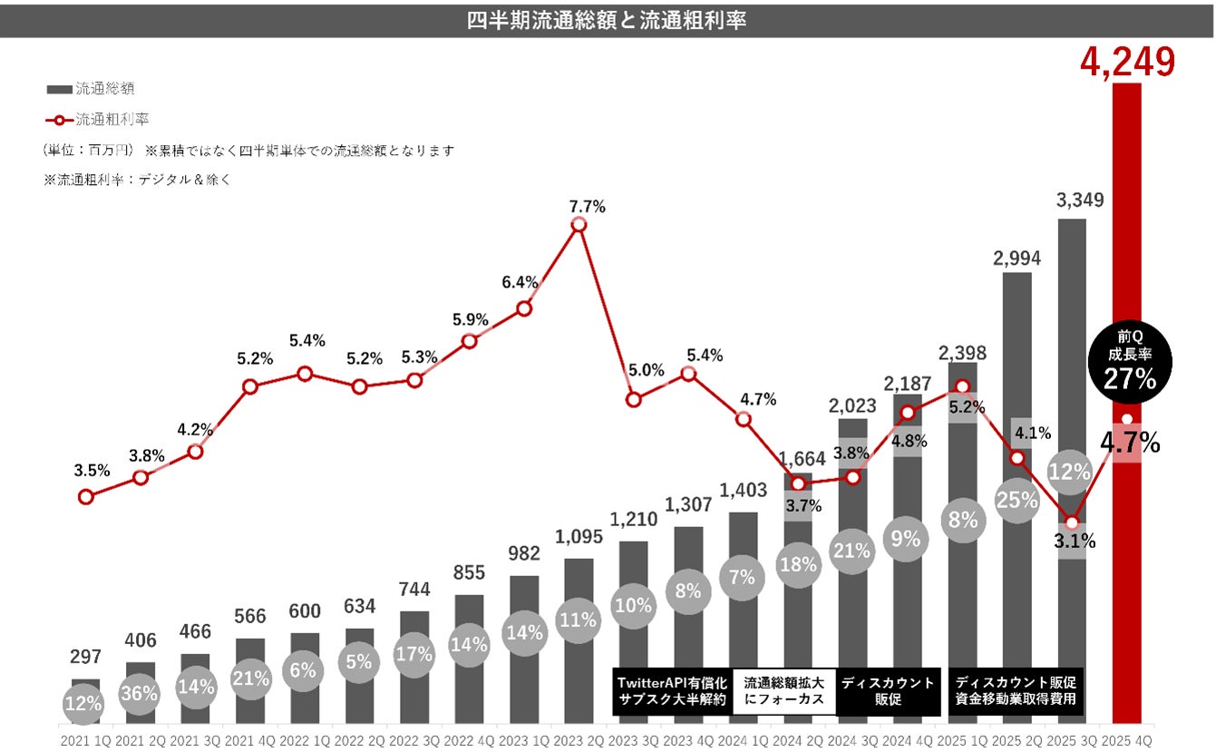 2025年9月期第4四半期においては、前四半期比127%となる約42.5億円まで増加し、月間流通35億円に向けて前進いたしました。「3万円以下のto C現金支払い」を、①広告領域 ②人材領域 ③金融領域の3軸にて網羅を目指してまいります。各領域における取り組みを強化し、2028年9月期に掲げている流通総額1,000億円を達成することで、圧倒的低手数料を実現し、より多くの企業様にご利用いただけるよう、更に邁進してまいります。