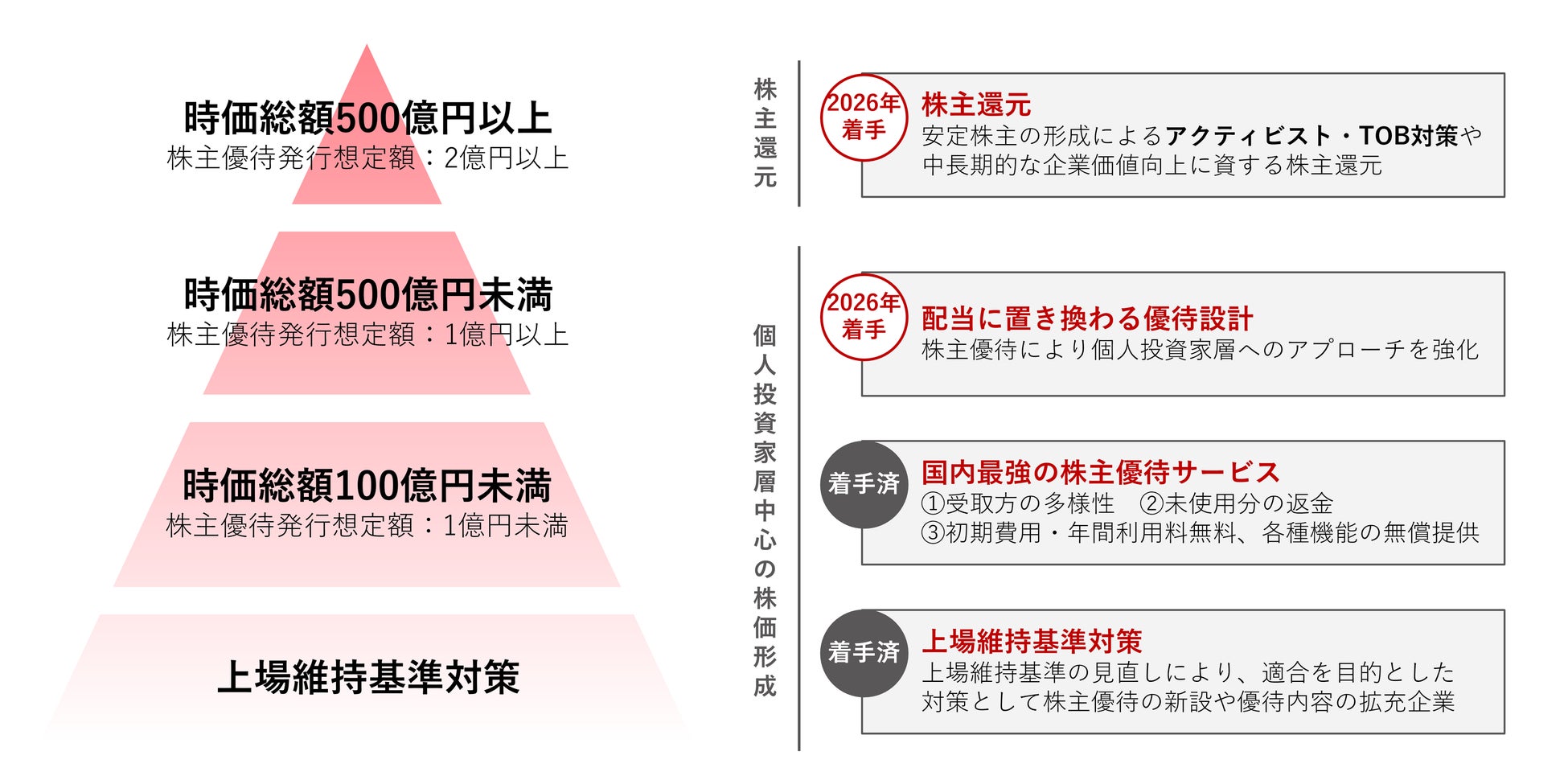 今後は、上場維持基準対策にとどまらず、配当に置き換わる優待設計や、アクティビスト・TOB対策など、中長期的な企業価値向上に資する株主還元施策の提供にも取り組みを拡大してまいります。また、これまで中心であった時価総額100億円未満の企業に加え、対象を時価総額500億円以上の企業へと拡大し、2028年までに導入企業500社・国内No.1の株主優待サービスの実現を目指します。