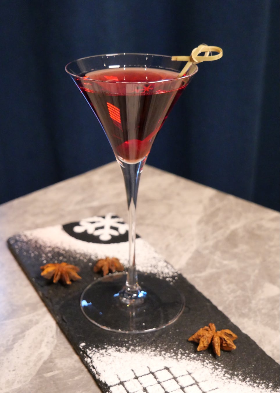 アール・デコ様式からの流れでロシア構成主義やドイツバウハウスのデザイン美に影響を受けている氏の作品に倣いカクテルの素材をアール・デコ発祥のパリのリキュール、ロシアのウオッカ、ドイツのジンの層を詰み重ねるように作ったマティーニ「Layer Martini」をご提供致します。厳かな気品を感じる作品に囲まれながら、少し大人なカクテルをお楽しみください。