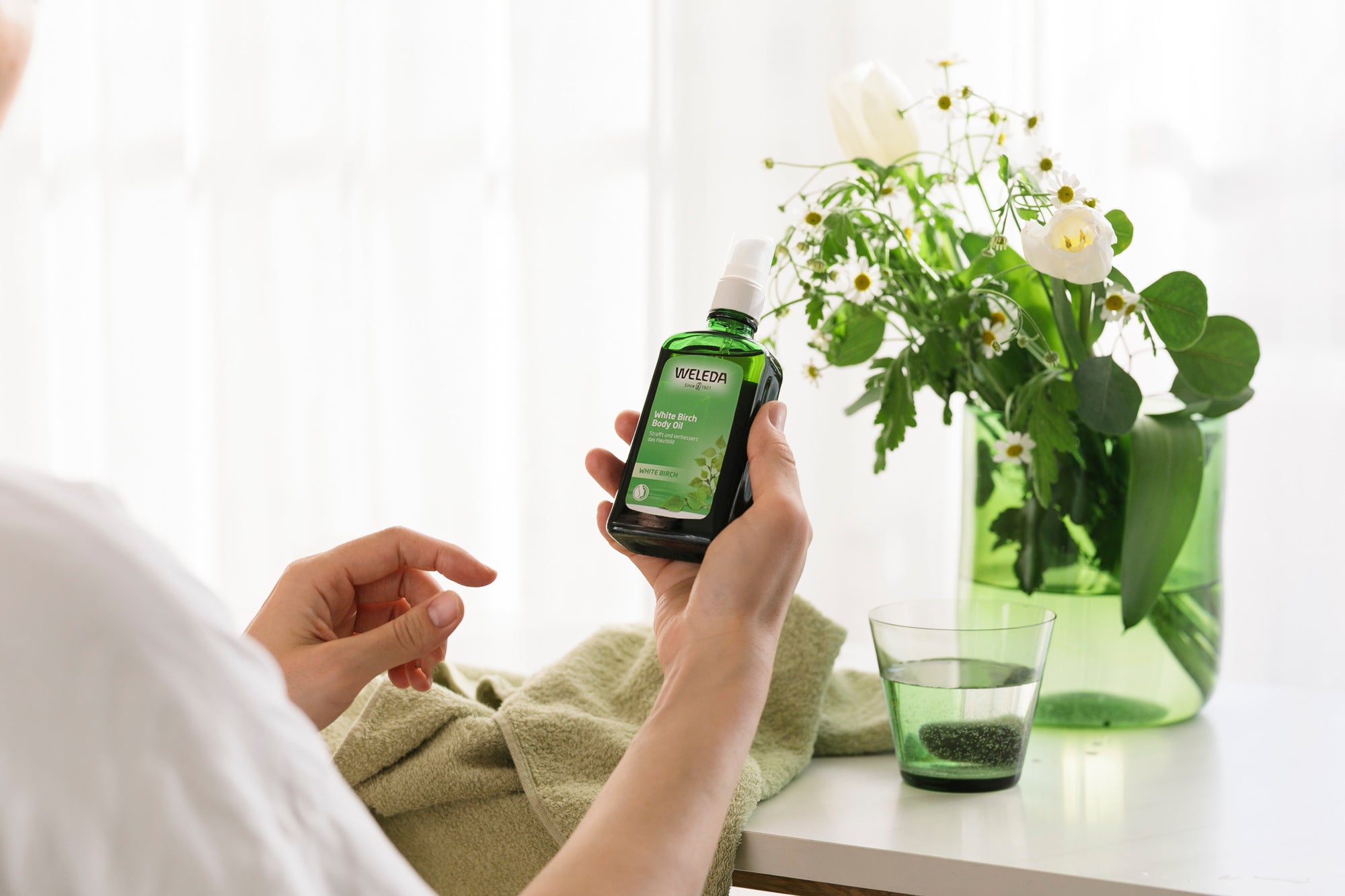 肌を引き締める白樺葉エキス* 配合の「ホワイトバーチ ボディオイル」は、立ち仕事などでむくみが気になる脚を心地よくマッサージ。