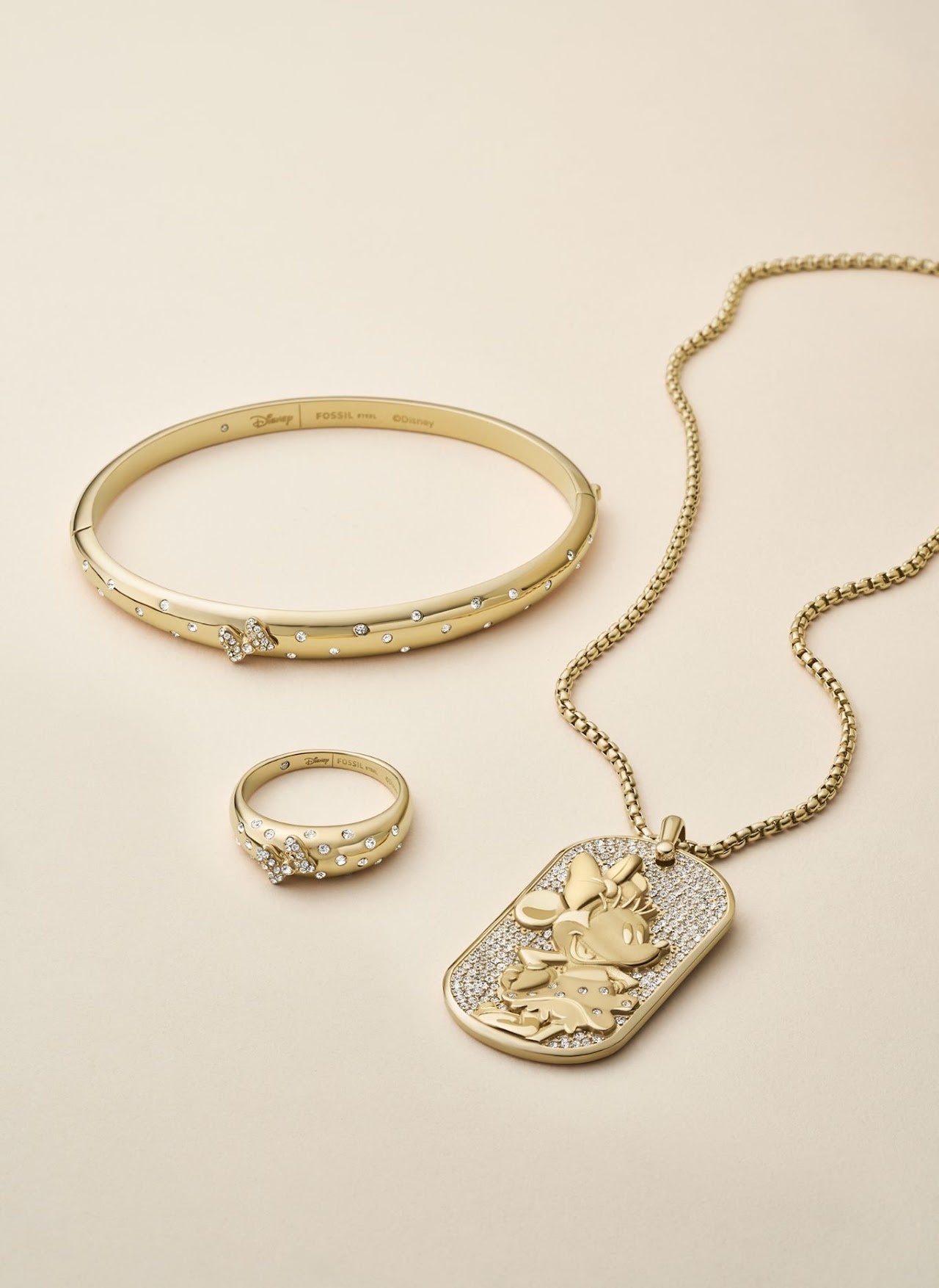 ミニーマウスのジュエリーコレクションは、ミニーの遊び心と洗練されたスタイルを表現。イエローゴールドトーンのステンレススティールに、手作業でセッティングしたパヴェ・クリスタルをミニーのリボンやドット柄に見立てています。