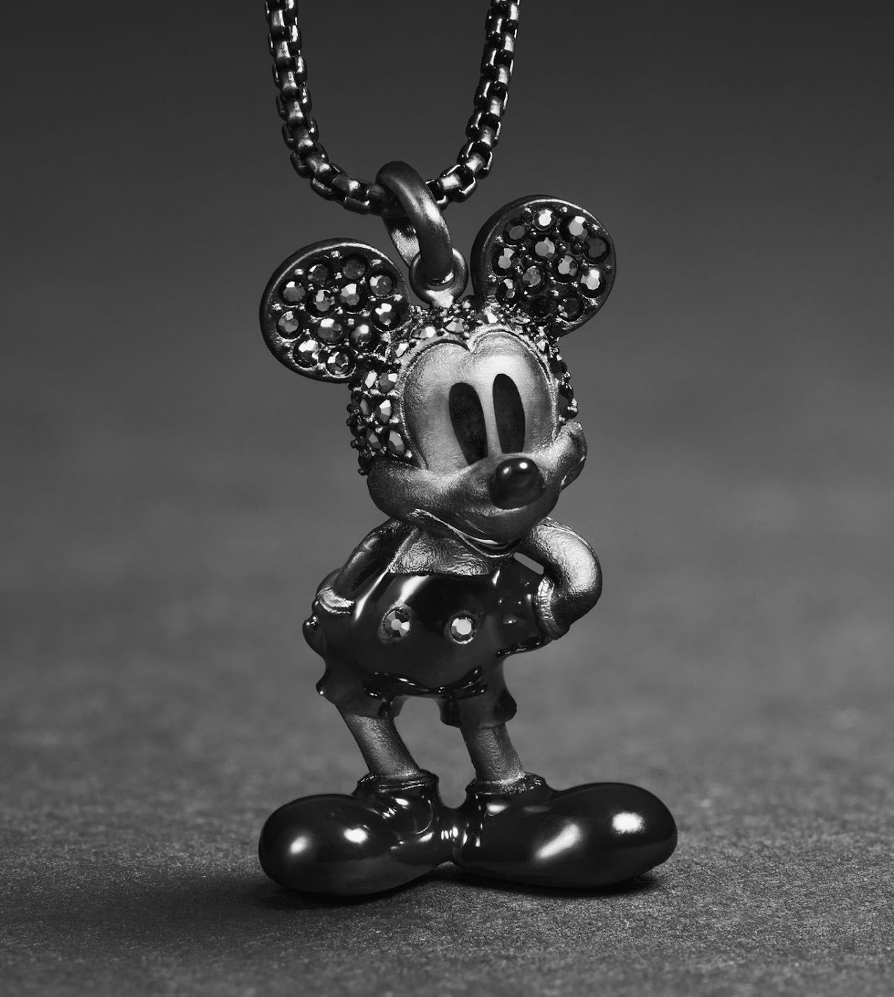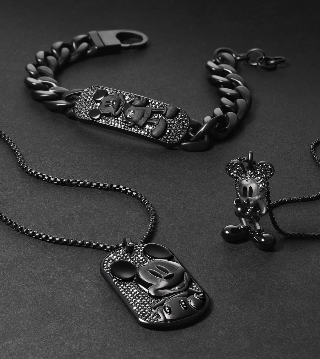ミッキーマウス ジュエリーコレクションは、手作業でセッティングしたパヴェ・クリスタルがアクセントになった、ブラックトーンのステンレススティール製ネックレス&ブレスレット。