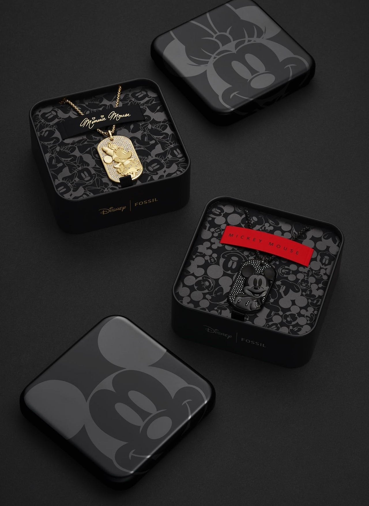 各ジュエリーは、ミッキーまたはミニーのカスタム・グラフィックをあしらったスペシャルティン缶に入っています。