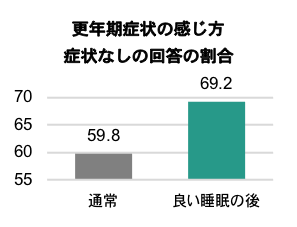 更年期症状の感じ方については、「症状なし」の回答割合が通常では59.8%だったところ、質の良い睡眠・十分な睡眠をとった後では69.2%まで増加し、症状を感じる人の割合が減少しました。これにより睡眠によって改善を感じる人が一定数いると推察されます。