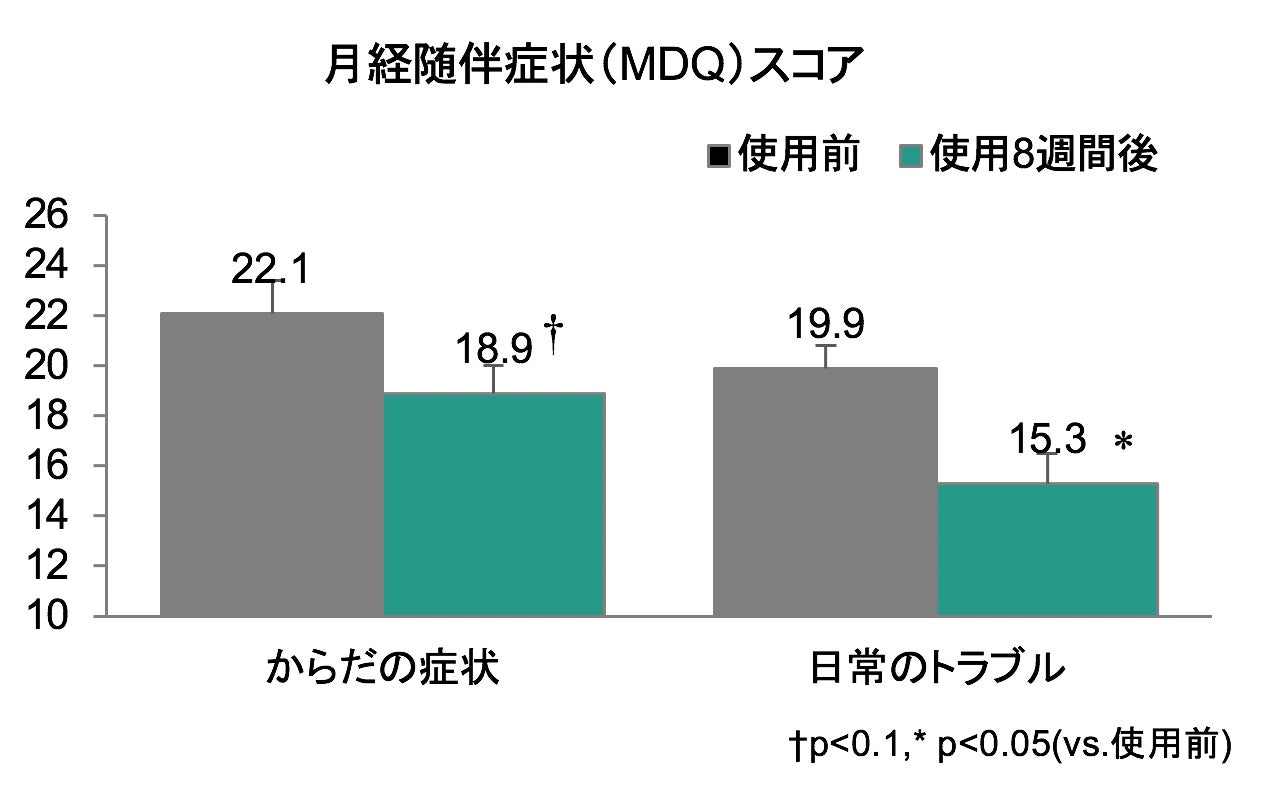 PMSに対する問診票の結果では、特に「日常のトラブル」「勉強や仕事への覇気が無くなる」「自信が無くなる、自分を責める」「頭が痛い」「冷や汗が出る」の症状が改善。