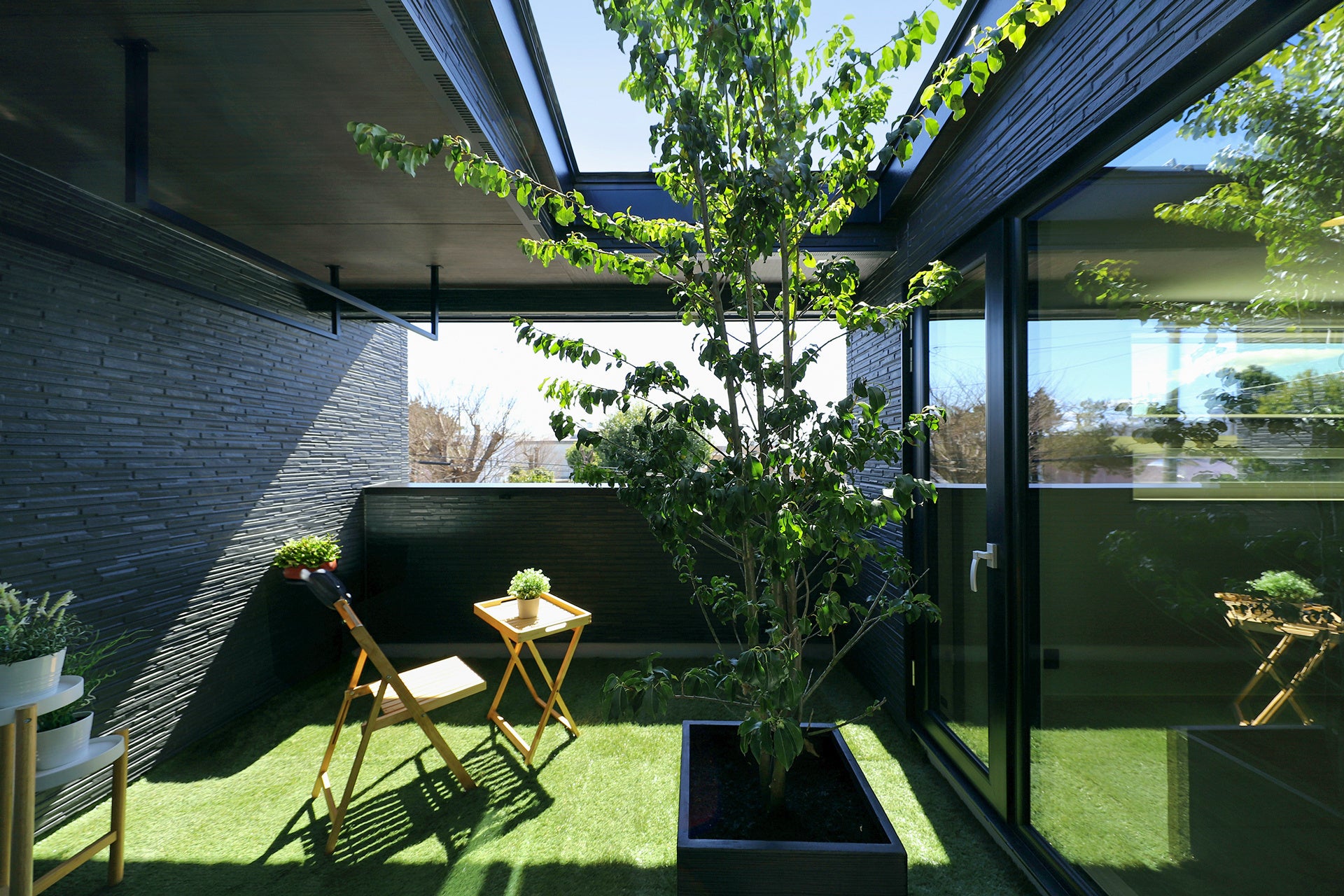 緑豊かな公園の前に立つ2階建ての住居計画です。黒をベースとした外観は、屹立する3枚のプレートで分節し、その深い陰影の中にアイキャッチとして白いボリュームを浮遊させデザインとしています。2階の中央部、公園を見下ろす絶好の場所に大きなテラスを設け、そのテラスを取り囲むようにLDKの諸室を配置しています。テラスには公園の緑と繋がる形で高木を配し、周囲のフルハイトのサッシから柔らかな光が室内へ屋根に穿たれた開口から緑が顔を出し、この家のシンボルツリーとして外観の印象を際立たせ、自然が常に住宅の一部であることを感じさせます。