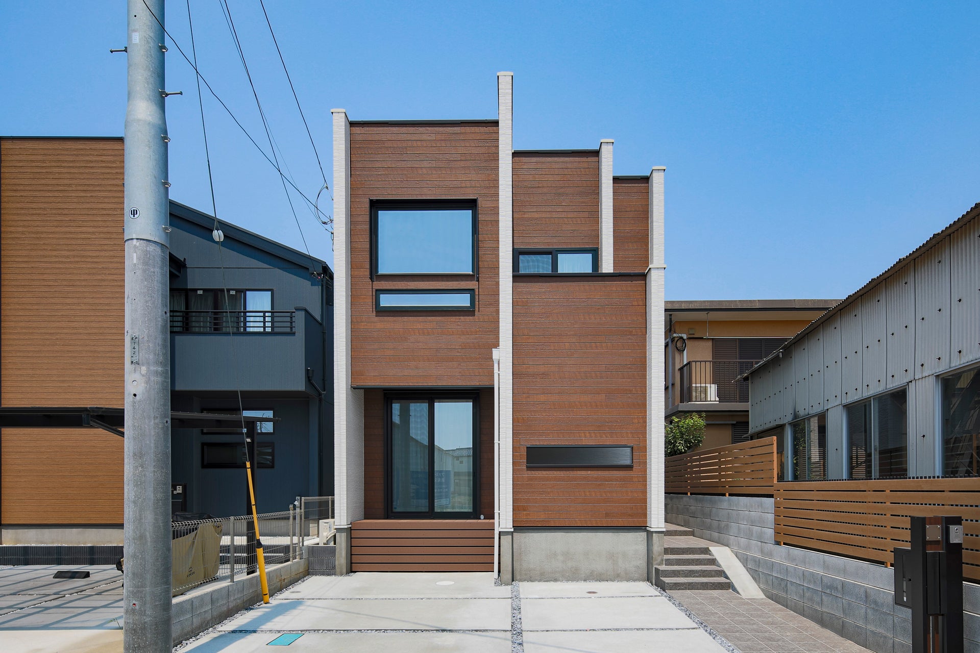 外観は白い4枚のプレートが並ぶリズミカルで彫刻的なフォルムに、大型FIX窓とスリット窓が印象的なファサードを形成しています。住宅の美観を損なわないよう、駐輪場を建物に組み込み、複合的なデザインで美しく変化に富んだ外観を実現しました。インテリアは広々とした吹き抜け空間を中心に、スチール製のストリップ階段や間接照明を用いて質感を向上させています。キッチンとダイニングの隣には大開口のウッドデッキテラスを設け、各室には個性的なデザインクロスを採用するなど、遊び心溢れるデザインとしています。