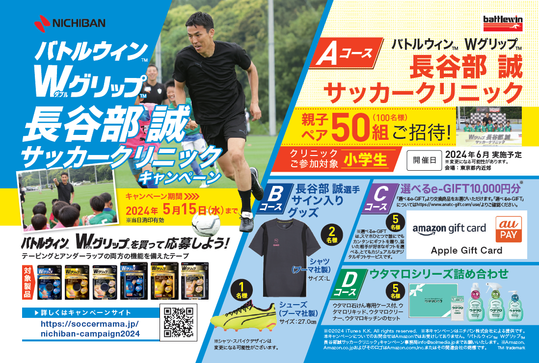本キャンペーンは「バトルウィン(TM)Wグリップ(TM)」シリーズを1個以上購入したレシートを郵送して応募いただくクローズドキャンペーンです。Aコースは、バトルウィン(TM)Wグリップ(TM)のアンバサダーを務める長谷部誠選手によるサッカークリニックに抽選で親子ペア50組(100名様)をご招待します。Bコースは長谷部誠選手のサイン入りシューズもしくはシャツが計3名様、Cコースは選べるe-GIFT10,000円分が5名様、Dコースはウタマロシリーズ詰め合わせが5名様にそれぞれ抽選で当たります。