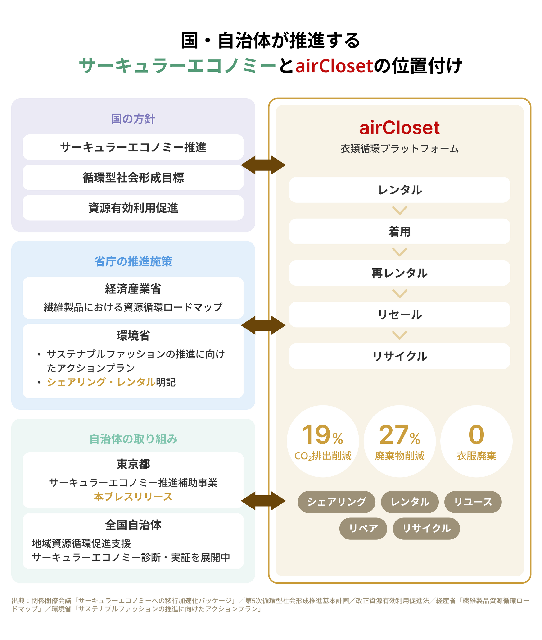 こうした状況を受け、政府はサーキュラーエコノミーへの移行を掲げ、資源循環の高度化や廃棄物削減に向けた方針を推進しています。ファッション領域においても、大量生産・大量消費型の構造から、資源循環を前提とした消費モデルへの転換が求められています。こうした中、購入に依存しない「循環型消費」の選択肢として、ファッションレンタルなどのサービスが注目されつつあります。