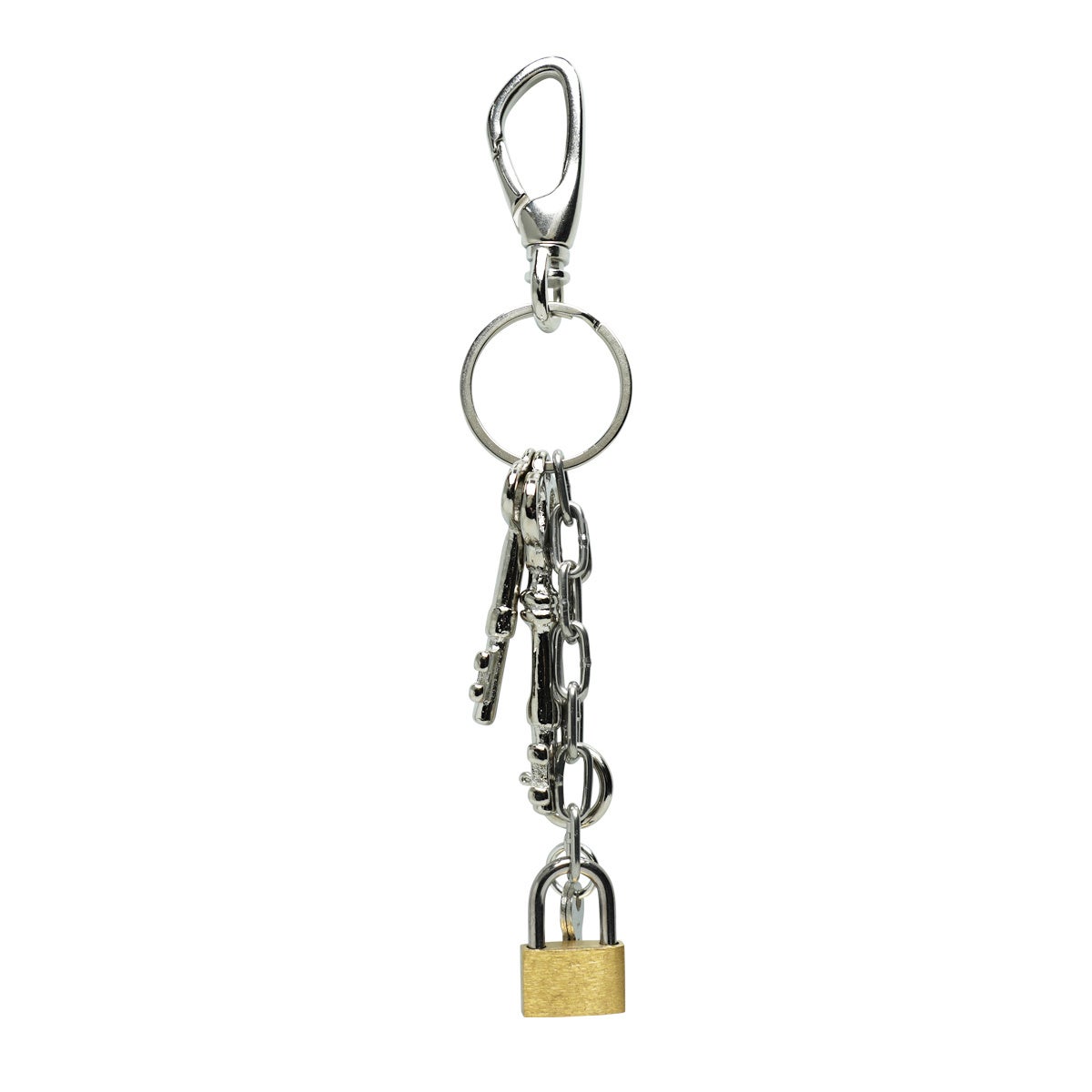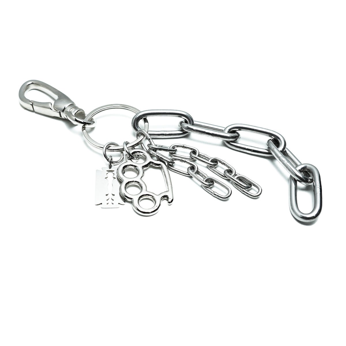 音と存在感を、あえて隠さない、見せるキーホルダー。ジャラジャラと鳴る金属音。装飾性を前面に出した、PUNKなキーホルダー。鍵をまとめるだけでなく、スタイリングのワンアクセントとして、バッグチャームとしても機能する。
