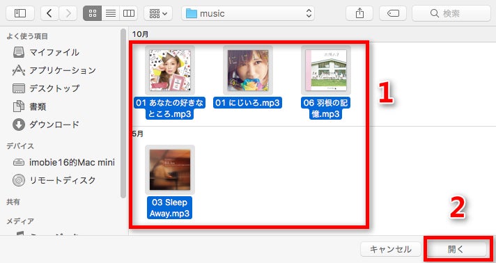 3.Macから転送したい音楽を選択して、「開く」をクリックします。
