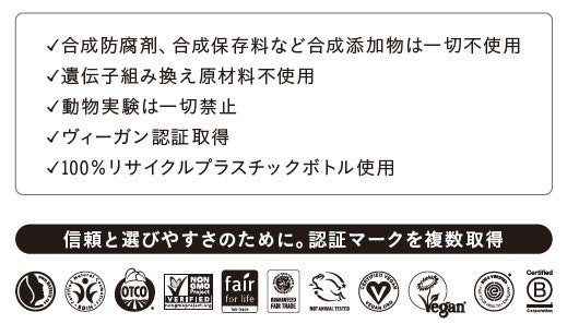 天然由来成分100%にこだわり、石油系界面活性剤、合成保存料、合成着色料、合成香料など合成添加物は一切使用していません。