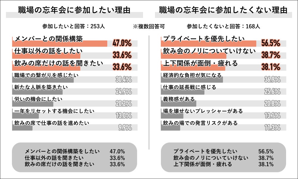 参加したいと回答した 253⼈にその理由を聞くと、「メンバーとの関係構築」が 47.0%で最多となり、次いで「仕事以外の話をしたい」「飲みの席だけの話を聞きたい」が同率で33.6%となりました。参加したくないと回答した 168 ⼈にその理由を聞くと、「プライベートを優先したい」が 56.5%で最多となり、次いで「飲み会のノリについていけない」が 38.7%、「上下関係が面倒・疲れる」が 38.1%となりました。