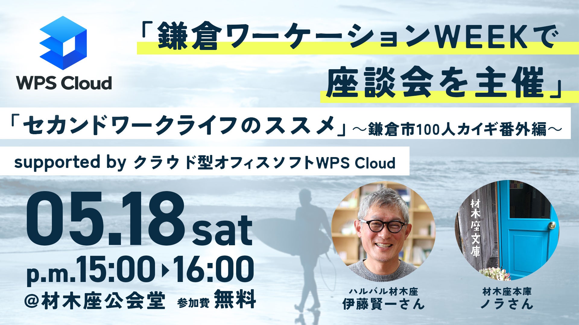 キングソフト株式会社(本社:東京都港区、代表取締役社長:瀬沼 悠)は、5月15日(水)〜18日(土)に開催される鎌倉発!ウェルビーイングに働く未来を共創するコミュニティ型イベント「第6回 鎌倉ワーケーションWEEK」に協賛し、5/18(土)15時から神奈川県鎌倉市の材木座公会堂にて、「セカンドワークライフのススメ ~鎌倉市100人カイギ番外編~ supported by クラウド型オフィスソフトWPS Cloud」と題した座談会を主催します。事前申し込み受付中ですので、お早めにお申し込みください。