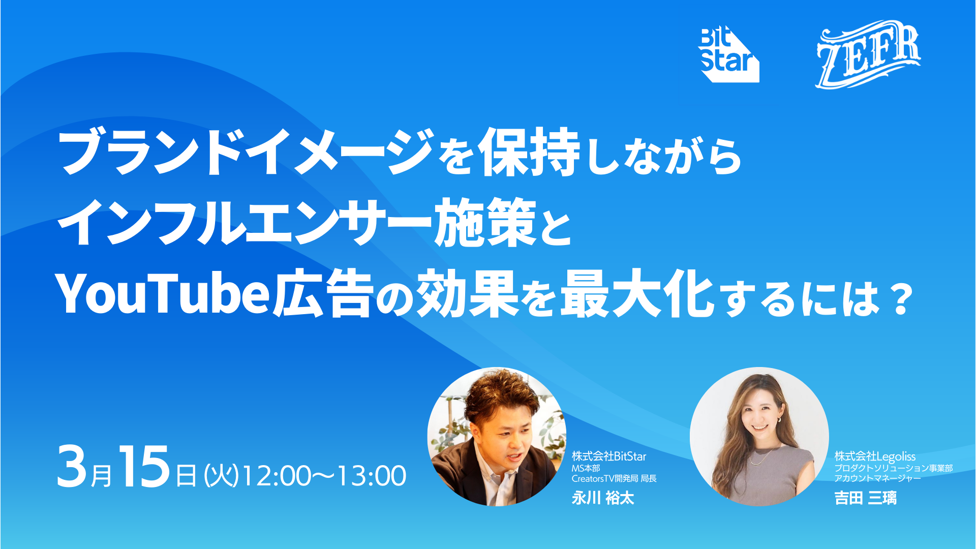YouTubeやTikTokをはじめとするインフルエンサーマーケティング事業を展開する株式会社BitStar(本社:東京都渋谷区、代表取締役 社長執行役員CEO:渡邉拓、以下BitStar)は、動画広告向けのソリューションを提供するZefr, Inc.(ゼファー、米国カリフォルニア州、CEO:Richard Raddon、Zach James、以下ZEFR)と、3月15日(火)12:00より企業さまへ向けたYouTube広告に関する無料ウェビナー「その施策、ブランドイメージを下げていませんか?YouTube広告とインフルエンサーの効果を最大化するZEFRを活用した最新手法」を共催いたします。