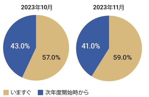 保育士バンク!の利用実績をもとに、当月の園の募集要件で、入職する タイミングが「いますぐ」なのか「次年度開始時」なのかの割合を算出、 前月と比較。