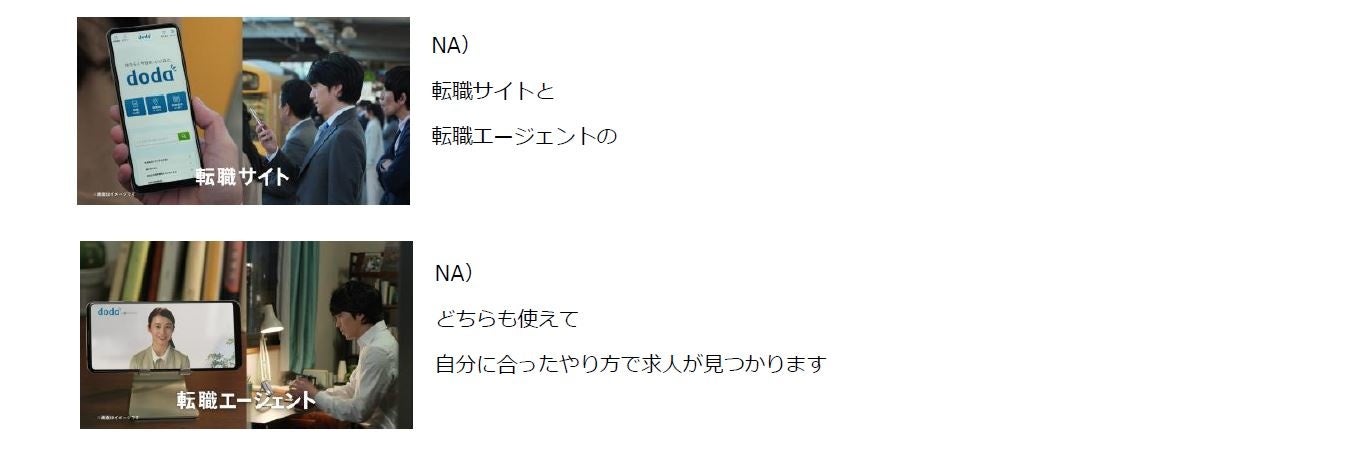8月1日(月)より放映開始の第三弾「合う転職なら」篇(転職サイトとエージェントどちらも使える)では、転職サイトと転職エージェント両方のサービスを提供する「doda」の特徴を表現しています。dodaの転職サイトは、大手有名企業をはじめとした多くの求人情報から、職種や勤務地などの希望条件を検索することができます。求人の選択肢を広げて調べたい方、まずは気軽に転職活動を始めてみたい方、自分のペースで転職活動を進めたい方におすすめのサービスです。また、転職エージェントサービスは、プロのキャリアアドバイザーが、転職希望者と企業をつなぐ役割を担い、経歴やスキル、希望を丁寧にヒアリングしながら、マッチする企業をご紹介します。転職サイトには掲載されていない非公開求人の紹介や書類・面接対策などのサポートも充実しており、自分に合う企業やはたらき方を相談しながら転職活動を進めたい方におすすめです。転職サイトとエージェントサービスを併せ持つdodaで、自身の希望するサービスを選択、使い分けることで、合う転職活動を叶えることができるというメリットを伝えています。