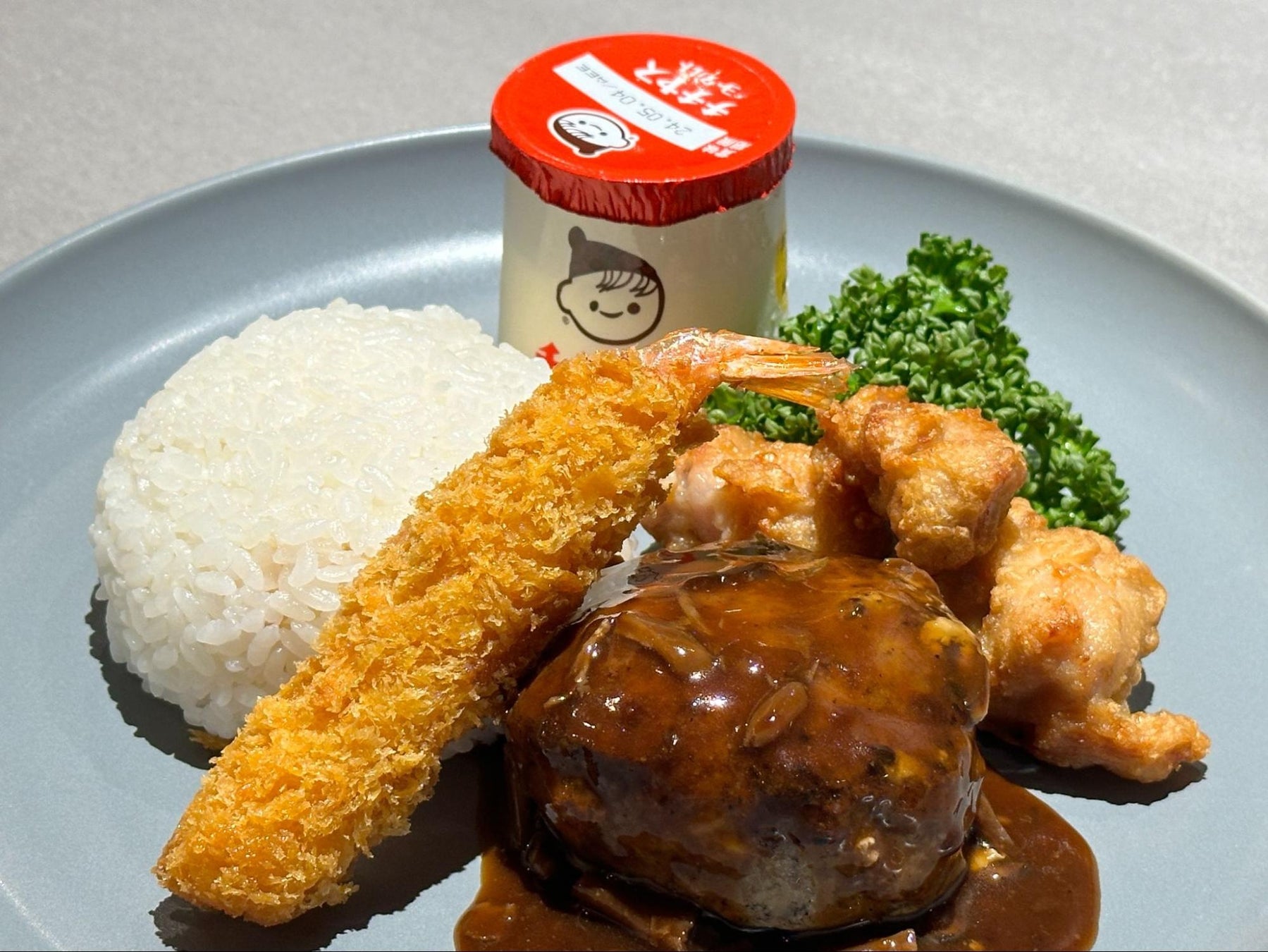 ステーキとハンバーグの専門店が焼き上げたハンバーグにエビフライ、カリカリに揚がった唐揚げが加わります。