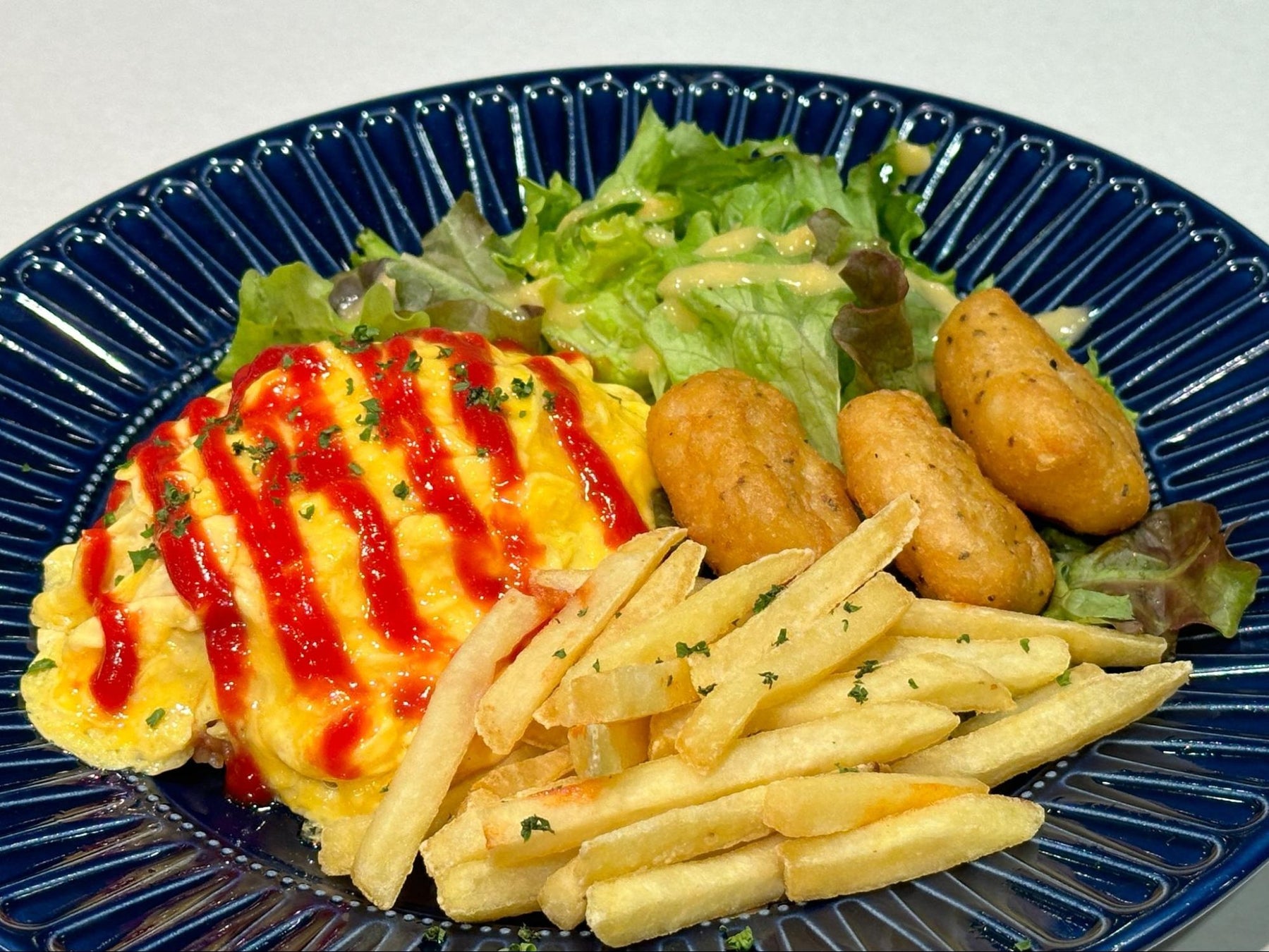 お子様が大好きな一品を詰め込みました。ふわふわのオムライスに、ジューシーなナゲット、サクサクのポテト、さらに神奈川県三浦市から直送される野菜を使用したサラダをご用意。野菜も摂れる一皿です。