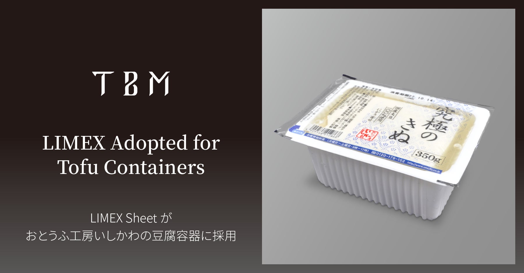 株式会社TBM(本社:東京都千代田区、代表取締役CEO:山﨑敦義、以下 TBM)の「LIMEX Sheet(ライメックスシート)」(真空成形*1グレード)が、株式会社おとうふ工房いしかわ(本社:愛知県高浜市、代表取締役:石川伸、以下 おとうふ工房いしかわ)のトップブランド「究極のきぬ」と「至高のもめん」シリーズの豆腐容器に採用されました。2023年1月より、おとうふ工房いしかわの直営店や全国のスーパーなどで販売が開始される予定です。