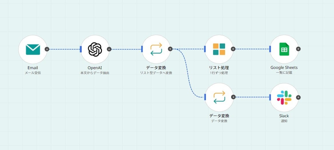 発注メールや在庫確認メールなど、フォーマットが異なるメールを受信後、GPTが解析し内容を整理したうえでスプレッドシートやExcelオンラインに転記する作業を自動化。