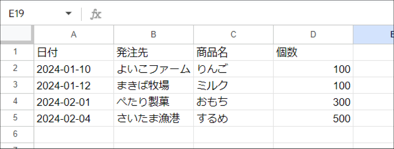 ①・2024/01/10 よいこファームのりんご 100こ ②・1/12 まきば牧場 ミルク 100ケース ③2月1日 ぺたり製菓 おもち 300袋 失注リスクあり ④・2024/2/4 さいたま漁港 するめ 500 |