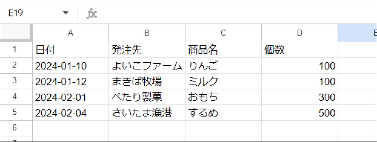 例えば、以下のような文章があり、「日付」「発注先」「商品名」「個数」をリスト化することが可能です。