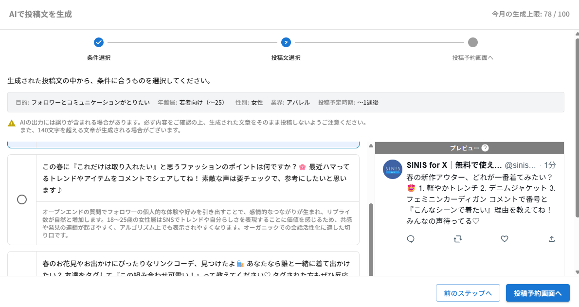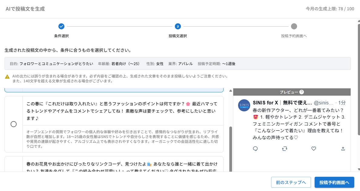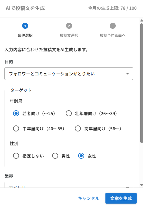 業界・投稿種別・ターゲット・時期を選ぶだけで、AIが投稿案を自動生成。予約投稿への連携も可能に