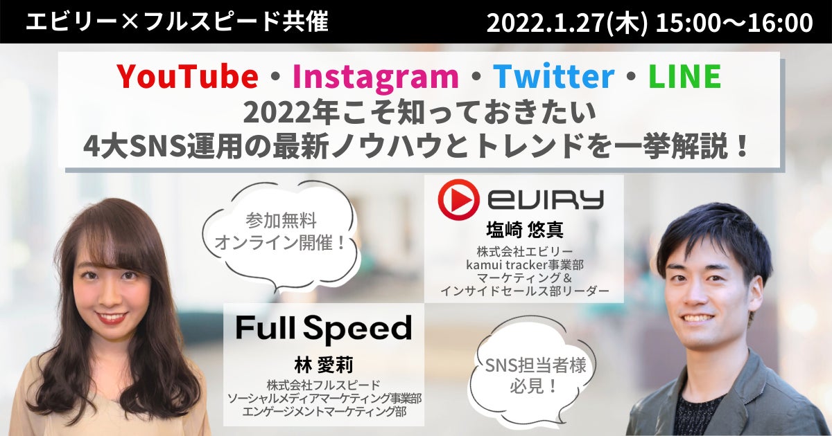 SNSをはじめとするインターネットマーケティング支援を行う株式会社フルスピードは、国内のYouTubeデータ分析ツールで企業やクリエイターのサポートを行う株式会社エビリーとの共催で、「YouTube・Instagram・Twitter・LINE 2022年こそ知っておきたい4大SNS運用の最新ノウハウとトレンドを一挙解説!」と題した無料オンラインセミナーを2022年1月27日(木)15時より開催いたします。