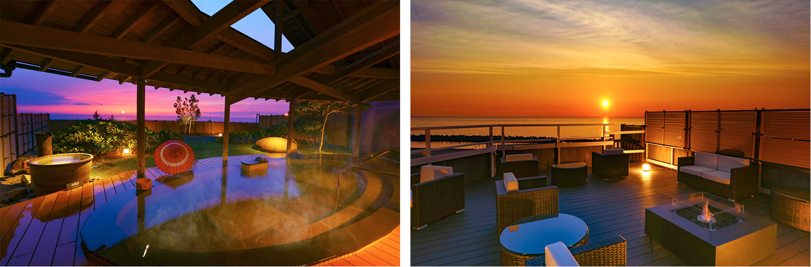 左:別名<熱の湯>とも呼ばれる高温で豊富な湯量の瀬波温泉が溢れる露天風呂。全国屈指の夕景を天然温泉に浸かりながら眺めるという非日常のひと時をお楽しみください。