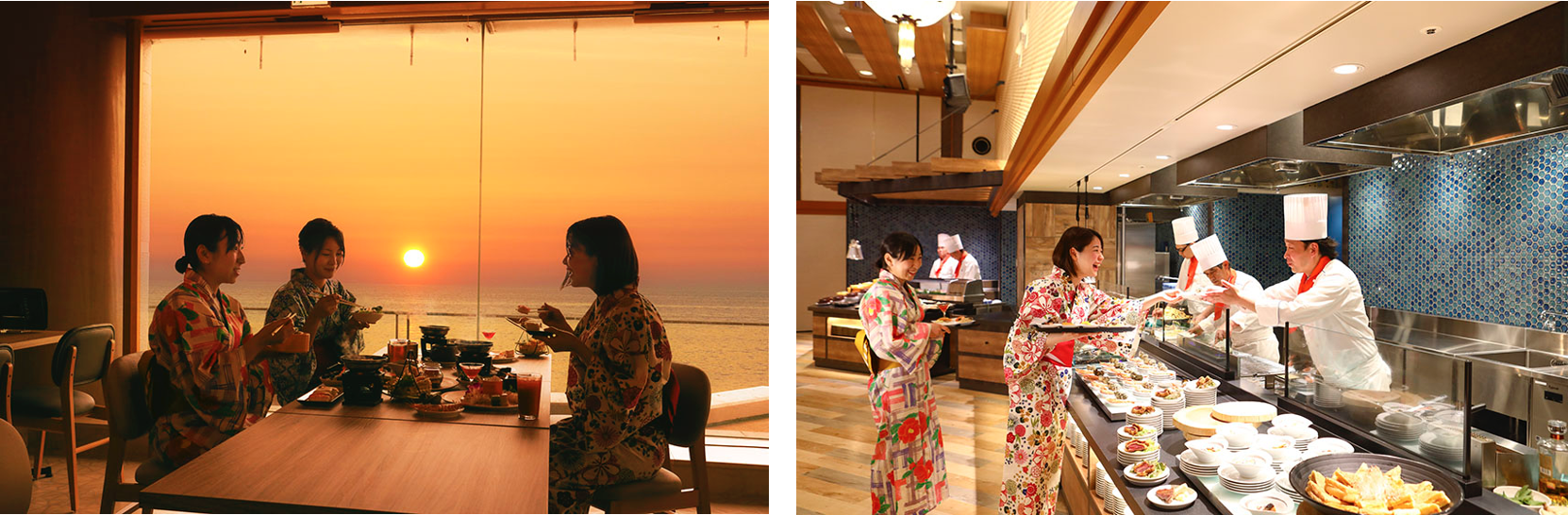 左:大きなガラス窓の向こう、日本海に沈む大きな夕日と共に楽しむ食事。