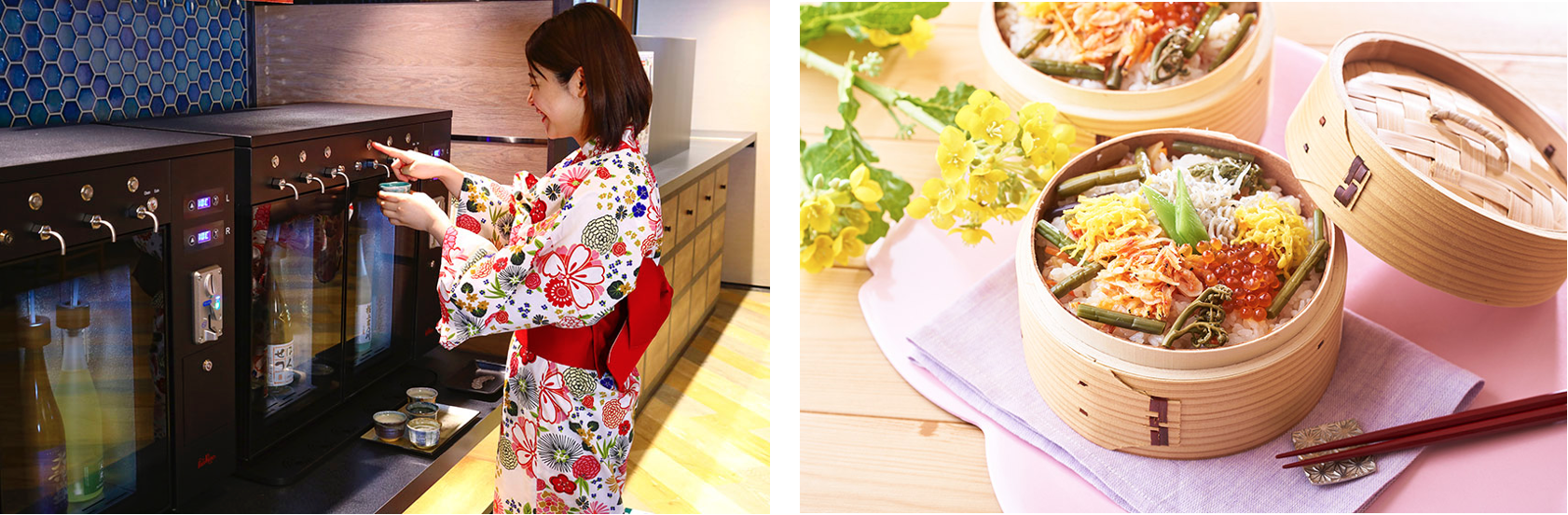 右:春の料理フェア(5月31日まで開催中)では「しらすと桜海老 山菜わっぱ飯」をお楽しみいただけます。新潟の郷土料理わっぱ飯の具材も、桜海老の赤、錦糸卵の黄色など、春を感じられる彩りも豊かな一品です。