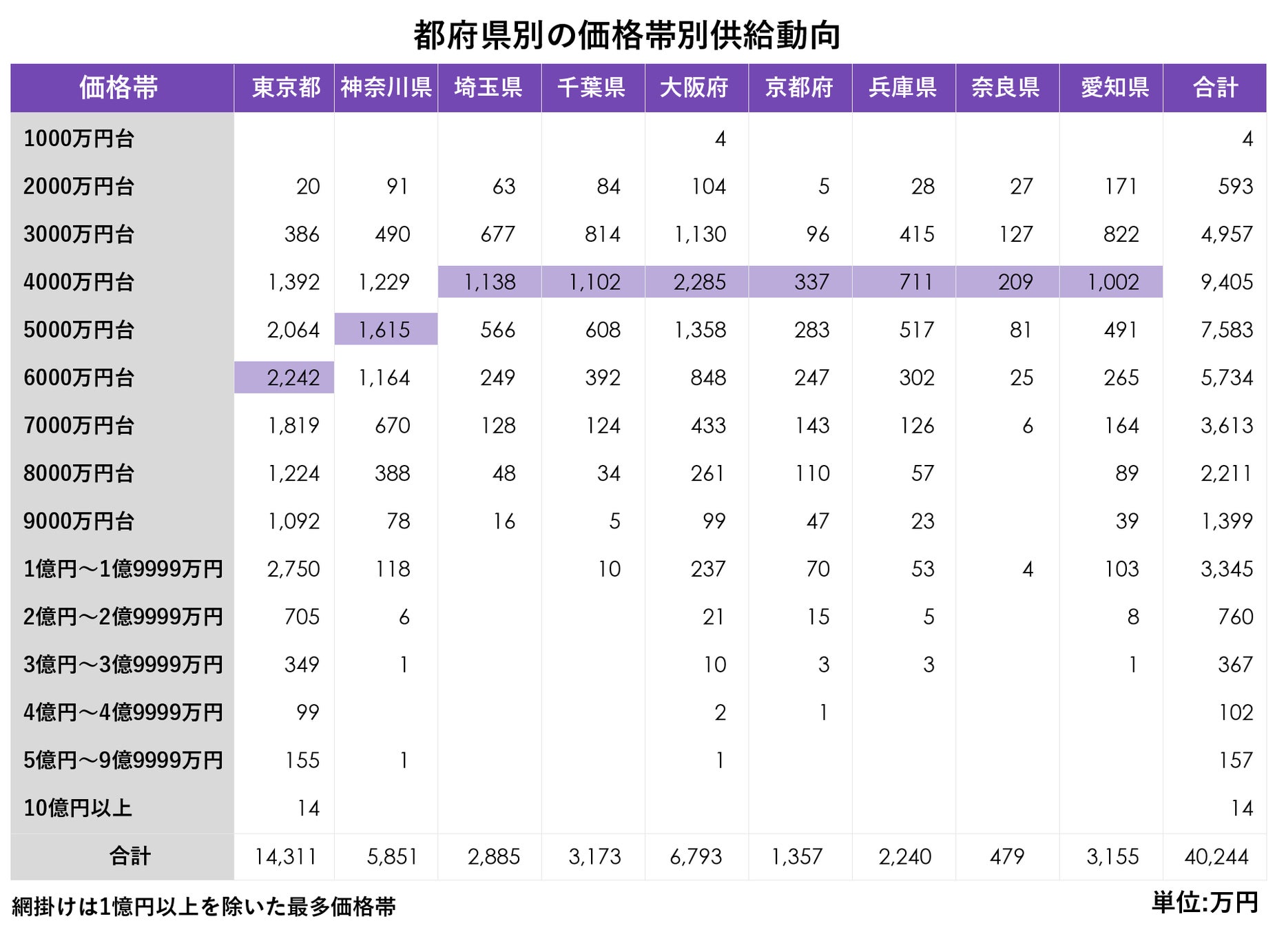 さらに価格帯別で見てみると、東京都と神奈川県を除く都市の最多価格帯は4,000万円台となっています。
