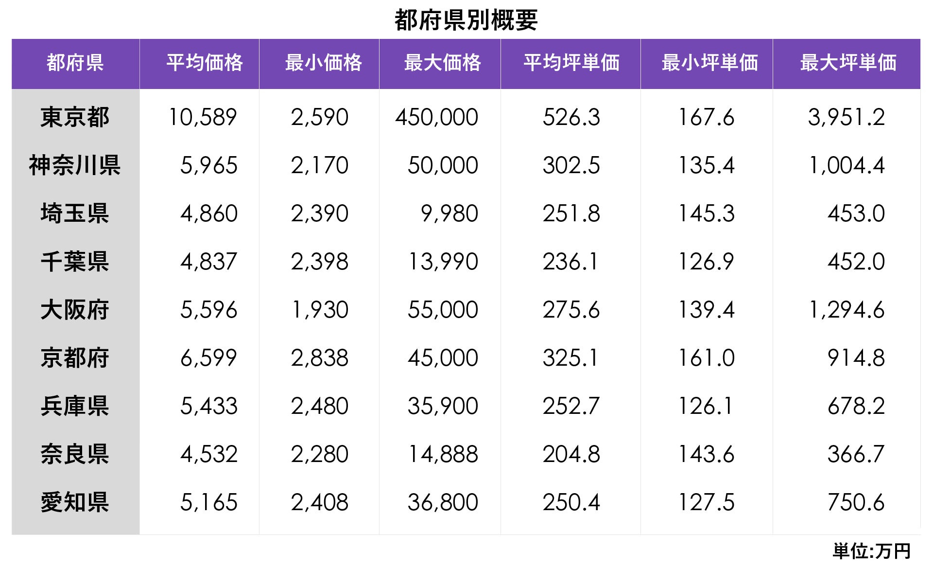 東京都の平均価格が1億円を超えたほか、京都府で6,599万円、神奈川県と大阪府、兵庫県、愛知県で5,000万円を上回るなど、各地域で高値となりました。