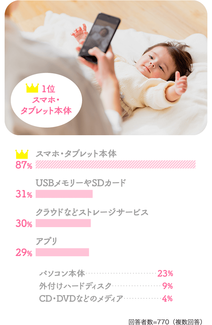 先輩ママたちの回答によると本体とは別に、USBメモリーやクラウド、アプリなどにも保存しているケースが多く見られました。スマホやタブレットの故障でデータが消えた、取り出せなくなったということがないように、大切な写真は別のかたちで保存することをおすすめします。