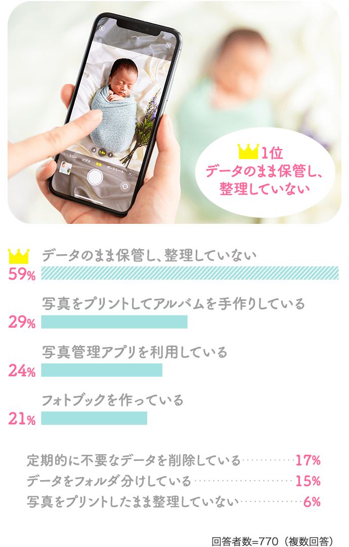 2021年9月に赤ちゃん本舗が実施した調査においても、約6割※2の方がせっかくたくさん撮った赤ちゃんの写真も、データ保管のままで整理ができていないという調査結果が出ています。