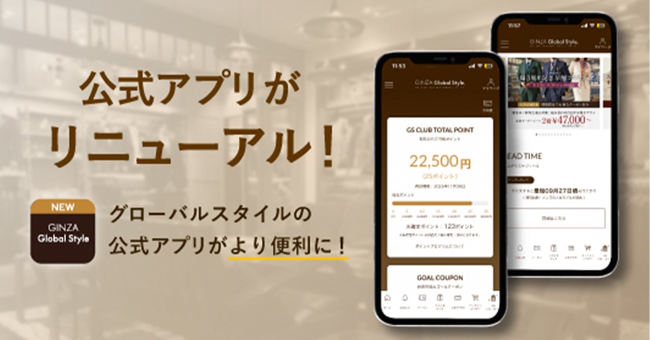 オーダースーツ専門店「グローバルスタイル」を運営するグローバルスタイル株式会社(東京証券取引所 スタンダード市場:7126、本社:大阪市中央区、代表取締役社長 田城弘志)は、ポイントサービスや、お得な情報を提供する会員様向けの「グローバルスタイル公式アプリ」をリニューアルアップデートいたしました。今回のアップデートにより、自動来店予約機能や特別クーポン配布、アプリ内でのスタイルブック閲覧など、さらに快適にご利用いただける機能が追加されました。