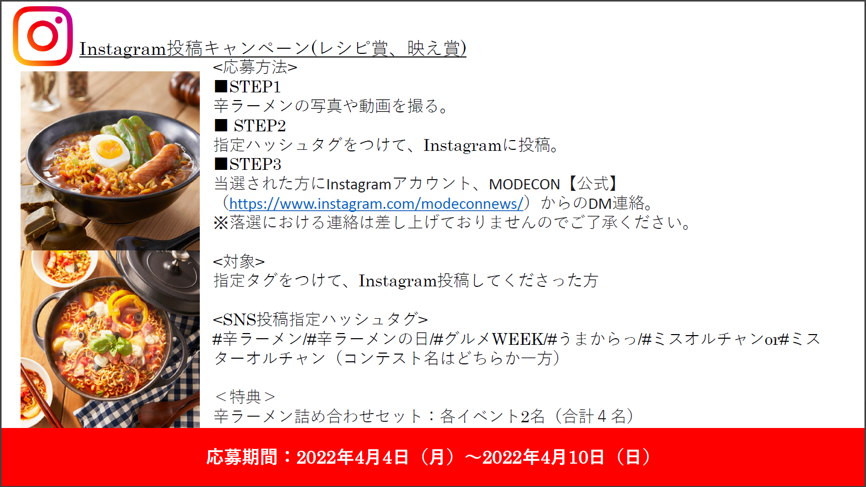 Instagramに「辛ラーメン」のアレンジレシピを指定ハッシュタグと共に投稿していただいた人の中から選考の上、各コンテスト2名(合計4名)に賞品が贈呈されます。