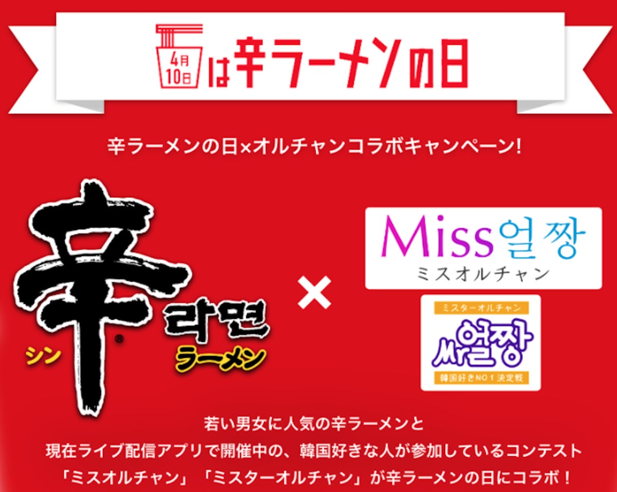 【インスタ投稿数7万超!配信プラットフォームとSNSで同時実施!】大人気の「辛ラーメン」が4月10日の「辛ラーメン」の日にむけて“辛ラーメンの日×オルチャンコラボキャンペーン”を開催!