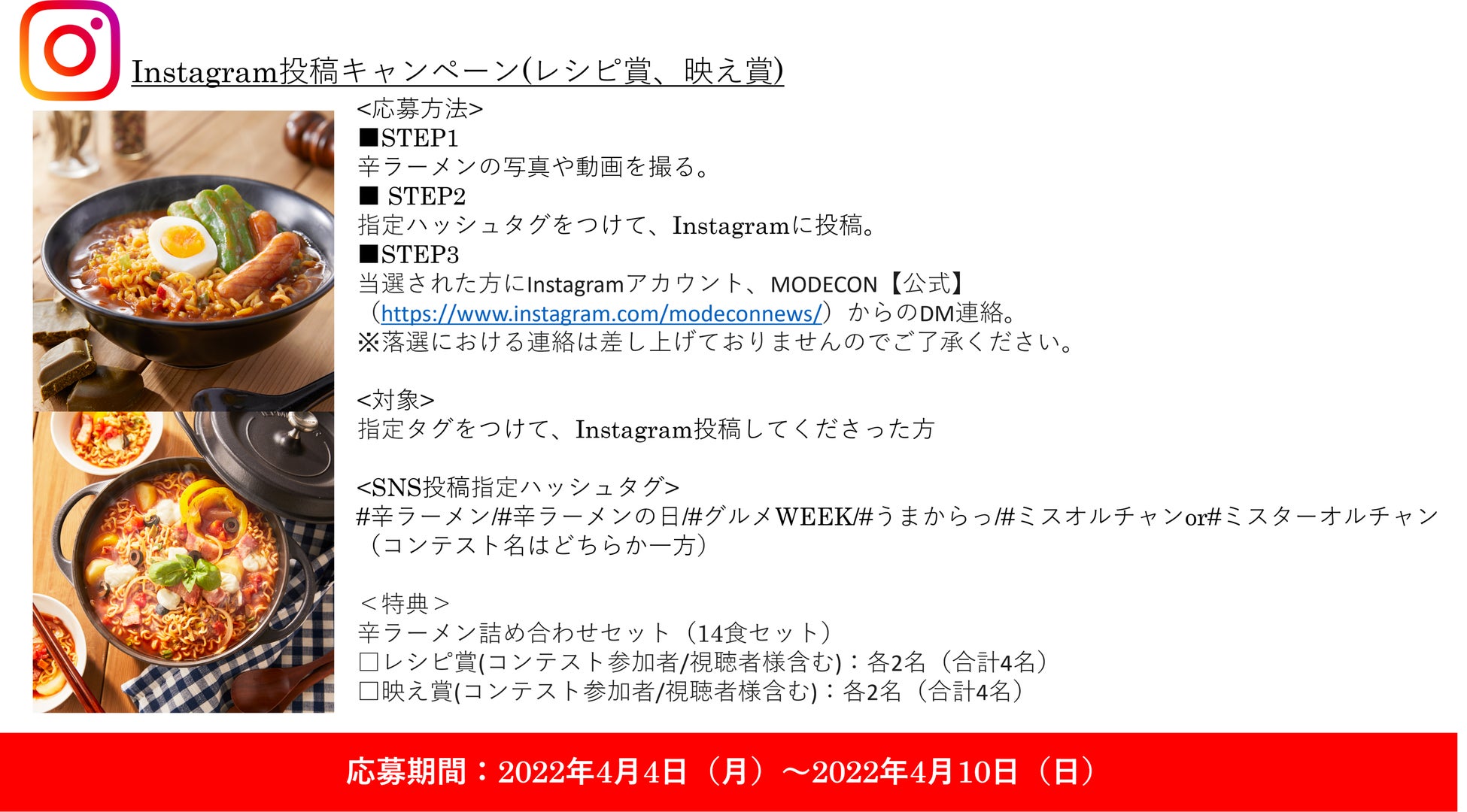 配信アプリLINE LIVE(ラインライブ)とミクチャで開催中の、当社主催のオンライン配信コンテスト「THE CONTESTミスオルチャン」、「MODECONミスターオルチャン」と「辛ラーメン」とのコラボキャンペーンとなっており、辛ラーメン詰め合わせ(14食セット)がコンテスト対象者に加え、SNSの投稿によって視聴者や辛ラーメン好きの方にもご参加いただけるキャンペーンとなります。
