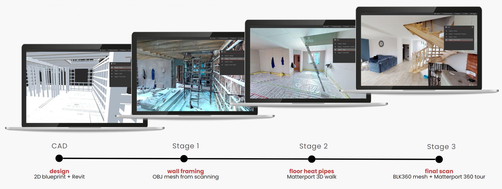 「Stages(ステージズ)」は、施工段階ごとにMatterportシステム等のVR撮影/3D測量により取得できるVR撮影データを使い、施工管理の質と効率性を向上できるサービスです。建設中から完成までの各段階の3D空間画像を重ね合わせ、視覚的に分かりやすいVR空間上で施工履歴管理、従来難しかった、建物完成時には確認できない隠ぺい部の施工履歴や施工証明を実現します。