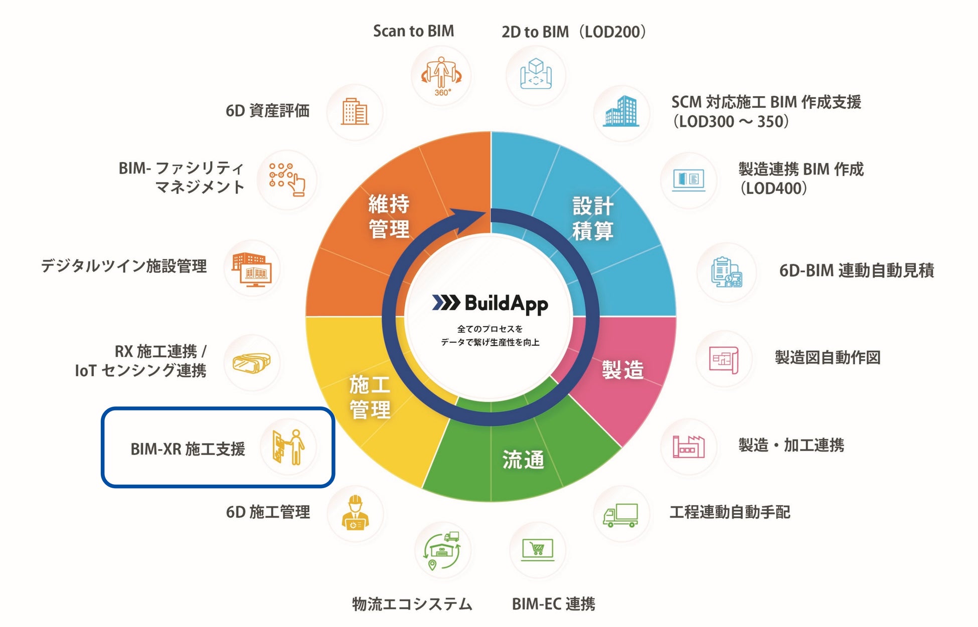 BIM設計-製造-施工支援プラットフォームBuildApp(ビルドアップ)は、設計事務所やゼネコンが作成したBIM設計データをより詳細なデータにし、各建設工程で必要なデータとして利活用し建設工程全体の生産性向上を実現するクラウドサービスです。