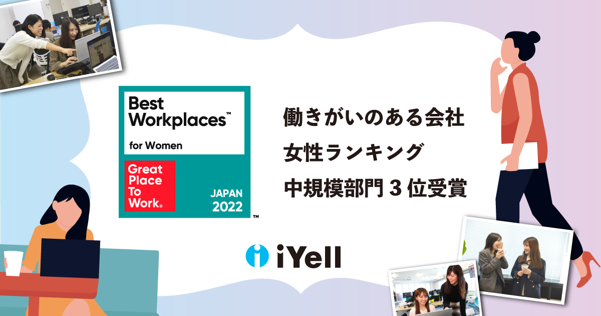 iYell株式会社(本社:東京都渋谷区、代表取締役:窪田光洋、以下「iYell」)は、Great Place to Work® Institute Japan(以下「GPTWジャパン」)が実施する2022年版「働きがいのある会社」ランキングにおいて、中規模部門・女性ランキングにて3位を受賞しました。2019年度では小規模部門にて3位を受賞しており、2度目の受賞となります。