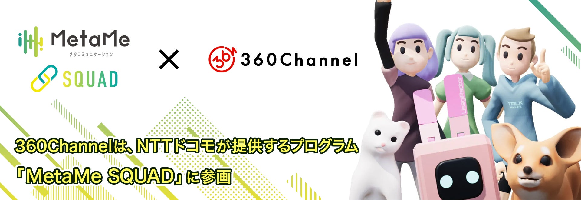 株式会社360Channel(本社:東京都港区、代表取締役社長:小松恵司、以下360Channel)は、株式会社NTTドコモ(以下、ドコモ)が企画と技術開発を行い、株式会社Relic(以下、Relic)が運営する「MetaMe® ※1」 を利用して、企業や団体がサービス提供やイベント開催などを手軽に行えるプログラム 「MetaMe SQUAD(メタミースクワッド)」へ参画しました。360Channelは、ドコモとの協力体制を一層強化することで、より効率的・革新的なソリューションの提供を目指します。