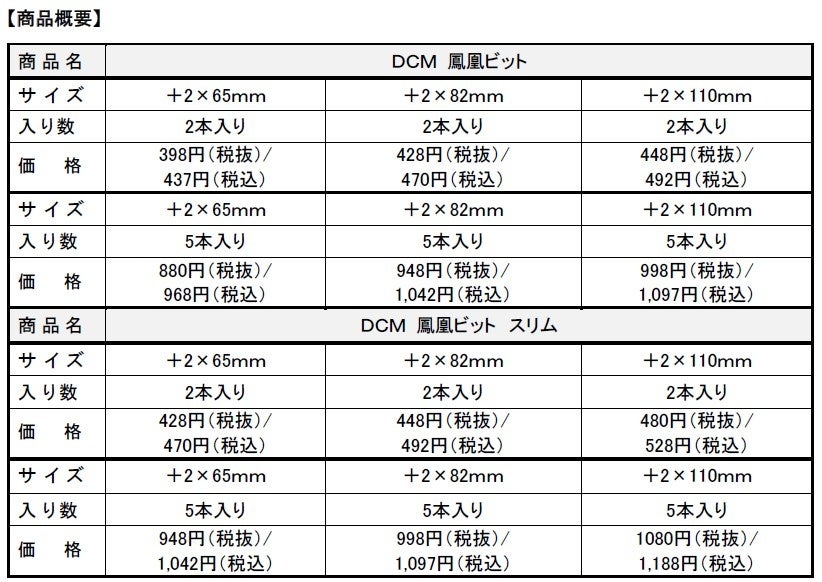 DIYが人気となっており、使用する工具にこだわる人が増えています。先端工具(ビット)は、電動工具でネジ類を締めたり緩めたりするために必要な部品で、高硬度素材で強度があるものが重宝されています。しかし、ユーザーからは高硬度素材のビットは価格が高いという声がありました。そこで、今回DCMは、高硬度素材を使用することにより強度と粘りを兼ね備えた「DCM 鳳凰ビット」を発売します。高トルクの電動工具を使用してもねじれに強く、トルクの伝達性能に優れた特性を持ちながら、お求めやすい価格の商品です。